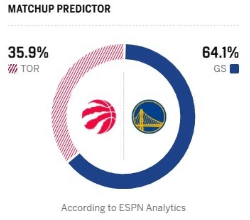 ESPN今日给出本场比赛的获胜概率预测,主队勇士为64.1%,客队猛龙仅为35.9%。