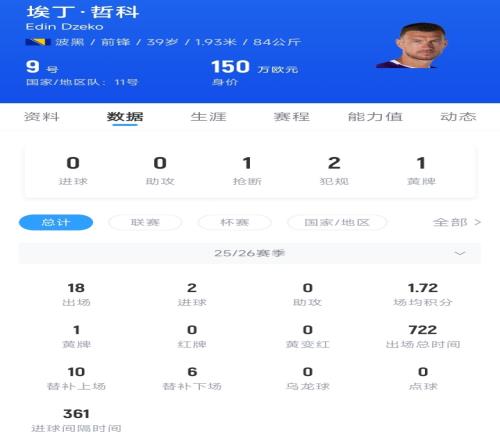 39岁的波黑前锋哲科,去年夏窗自由身加盟意甲佛罗伦萨,本赛季至今18场2球,其中意甲11场0球。在2007年至2011年间,哲科曾在德甲沃尔夫斯堡效力,夺得1次德甲冠军和德甲金靴。目前哲科的德转身价为150万欧元。
